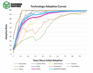 Сравнив криптовалюты с прорывными технологиями прошлого, эксперты Blockware Intelligence пришли к тому, что принятие Биткоина может произойти с куда большей скоростью, чем в своё время произошло глобальное распространение электроэнергии или автомобилей. Свой прогноз сотрудники Blockware Intelligence построили на основе анализа кривых принятия девяти прошлых прорывных технологий, сравнив их с аналогичным показателем для Биткоина с момента запуска его блокчейна. Все прорывные технологии следуют по похожему S-подобному экспоненциальному паттерну.